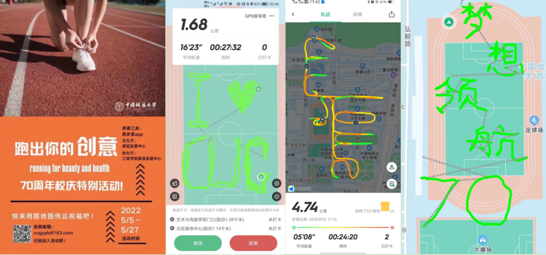 “我愛CUG”“夢想領航70”……這是地大學子在校園里留下的奔跑軌跡。為了激發學生鍛煉熱情,5月以來,本科生院通過組織“跑出你的創意”活動,鼓勵廣大學子在加強體育鍛煉的同時,上傳計步軟件記錄的運動軌跡,引導學生跑出創意,跑出風采。