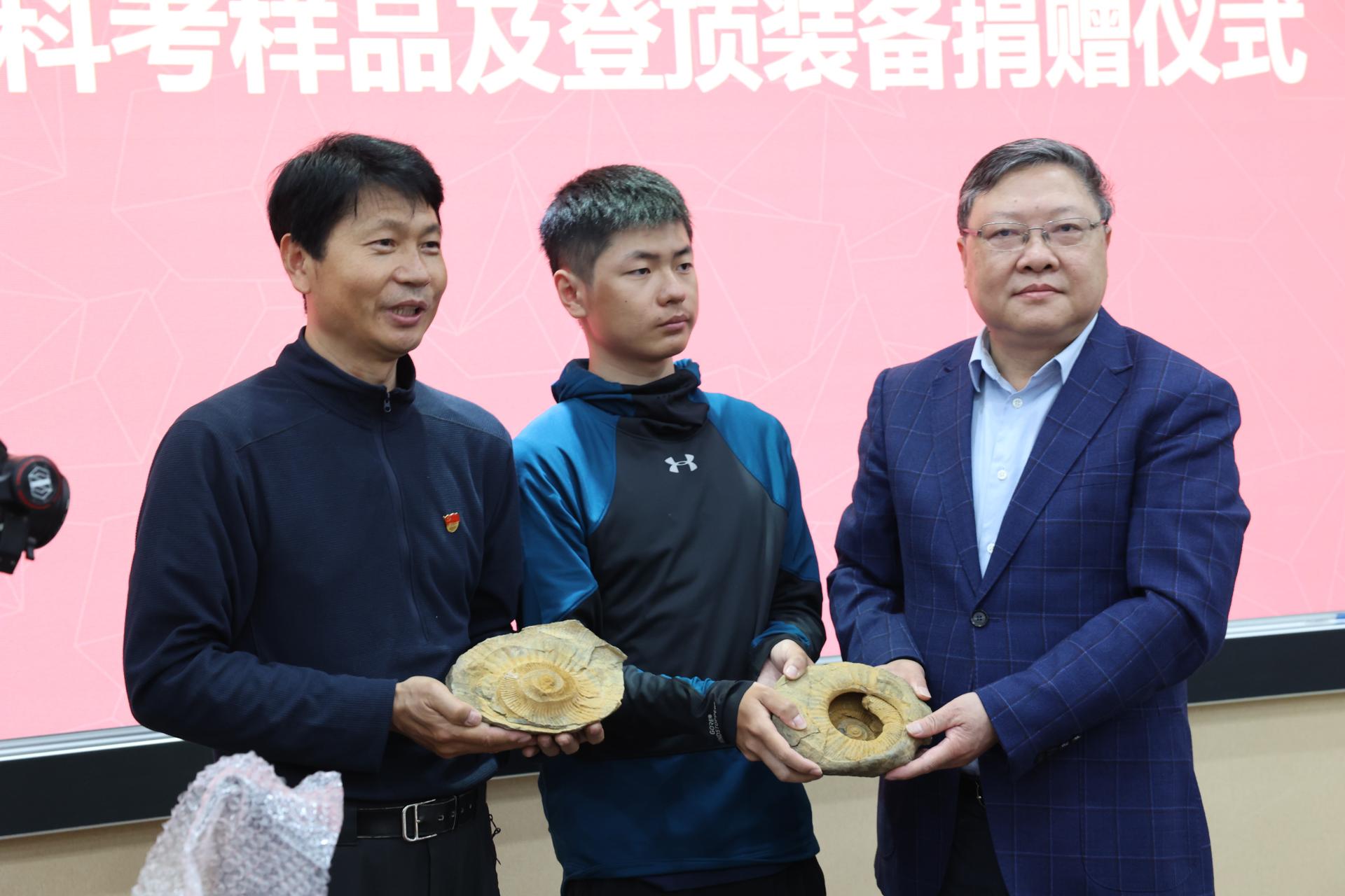 儲祖旺代表學校接受陳剛教授珠峰科考登山捐贈物品。此次陳剛捐贈的物品包括珠峰科考標本樣品7樣、登頂珠峰紀念物品2類、攀登珠峰影像資料2類和登頂珠峰郵政紀念品1類。