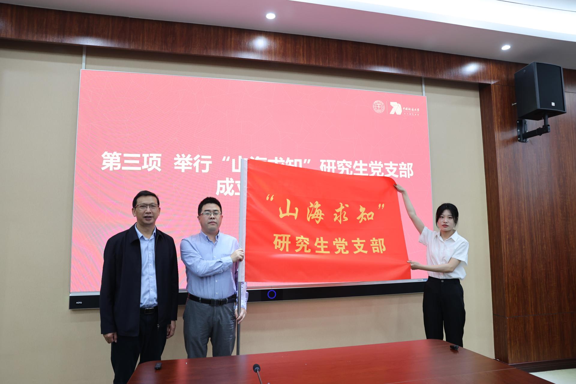 成金華為“山海求知”研究生黨支部成立授旗。該研究生黨支部是由陳剛教授牽頭成立的縱向設置的研究生黨支部,黨支部將依托陳剛教授科研團隊力量,夯實基層黨支部建設,打造堅強戰斗堡壘,促進黨支部黨建和科研工作的深度融合,扎實推進黨建示范和質量創優工作。