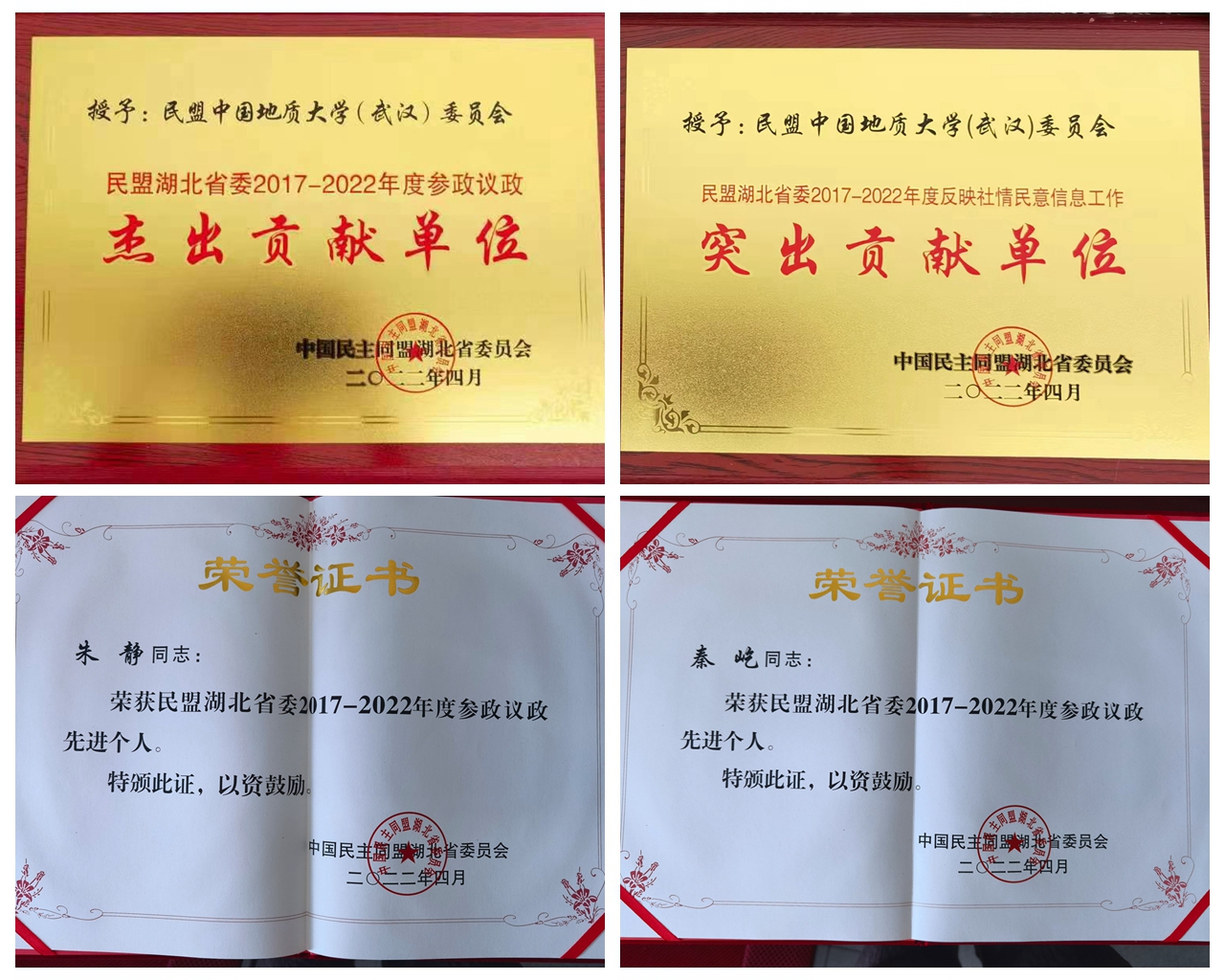 民盟地大委員會獲多項表彰:授予“2017-2022年度參政議政杰出貢獻單位”“2017-2022年度反映社情民意信息工作突出貢獻單位”。民盟地大委員會副主委朱靜、秦屹分獲“2017-2022年度參政議政先進個人”,同時秦屹還獲“2017-2022年度反映社情民意信息工作突出貢獻個人”。