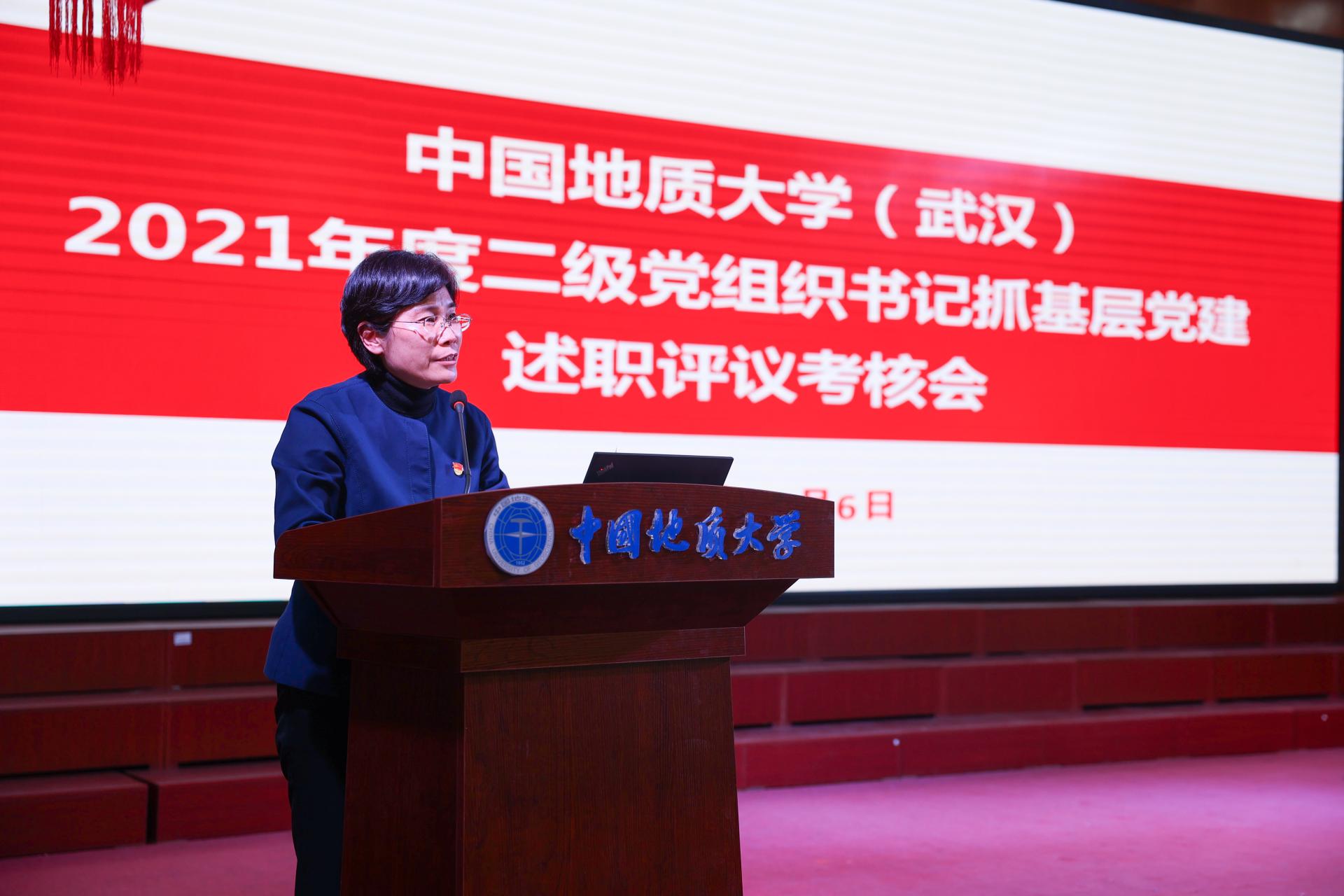 成金華、唐輝明、賴旭龍、王林清、劉杰、劉勇勝、儲祖旺等黨委常委結合現場述職、日常工作了解和審閱述職報告等,對現場述職的12位二級黨組織書記逐一作了點評,對加強和改進基層黨建工作提出了針對性的意見,并充分肯定了現場述職的12個二級黨組織黨建工作特色。如機關黨委做實“我為群眾辦實事”實踐活動,推進落實“首問負責制”和“最多跑一次”,提升師生服務體驗;遠程與繼續教育學院黨總支部推出黨史學習教育“四張清單”,啟動“學生微服務”,及時解決學生急難愁盼問題;高等研究院黨委積極探索黨建與科研互融互促,黨支部建在實驗室,黨小組建在科研團隊;教育研究院黨總支部初步構建融合式基層黨建工作體系,以“雙融合”帶動“雙提升”;期刊社黨總支部結合業務工作開展黨史學習教育,舉辦以“學習歷史擔使命,再創佳績迎百年”為主題的青年編輯演講比賽;后勤黨委增強黨組織政治功能,開展“樣板支部”培育建設和后勤研究型課題結題考察工作;資產公司黨總支部以企業“打造和諧園區”為契機,開展“偉人故里尋初心,肩負使命跟黨走”專題黨務活動;圖書檔案與文博黨委策劃并組織了地大紅色故事編撰和宣傳推送工作;醫院黨總支部強化服務意識,推行“無接觸式”公費醫療報銷服務;出版社黨總支部制定意識形態責任制實施細則,層層簽訂意識形態工作責任書;附屬學校黨總支部開展“知黨情 跟黨走”紅歌比賽、“紅心向黨、真美啟航”開學典禮暨建黨百周年慶祝活動;離退休工作黨委推進智慧黨建,啟動離退休信息系統二期建設。