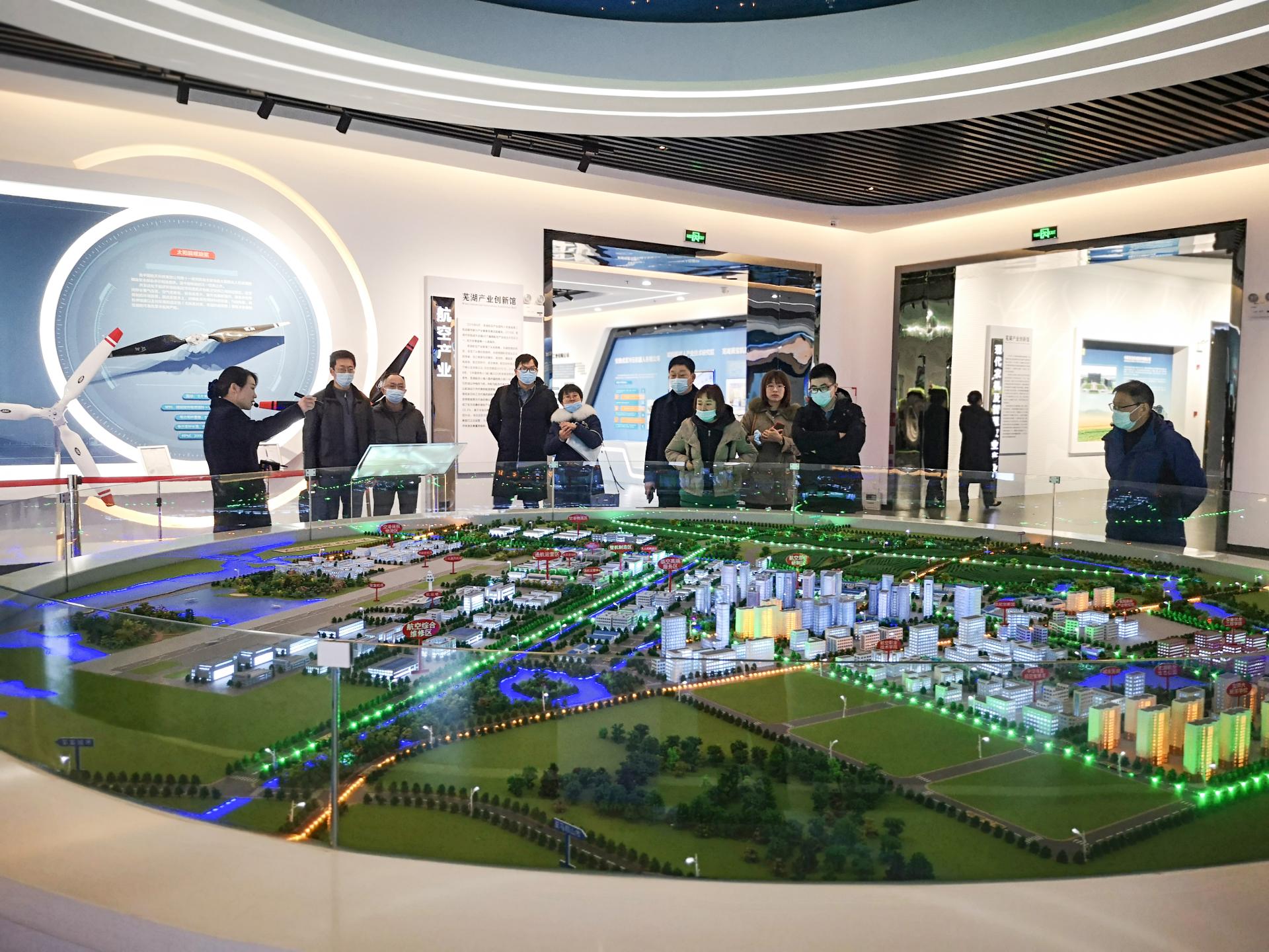 鳩江區(qū)政府副區(qū)長馮中陪同瞿祥華一行參觀蕪湖市產(chǎn)業(yè)創(chuàng)新中心,工作人員為老師們介紹了各類技術創(chuàng)新成果。