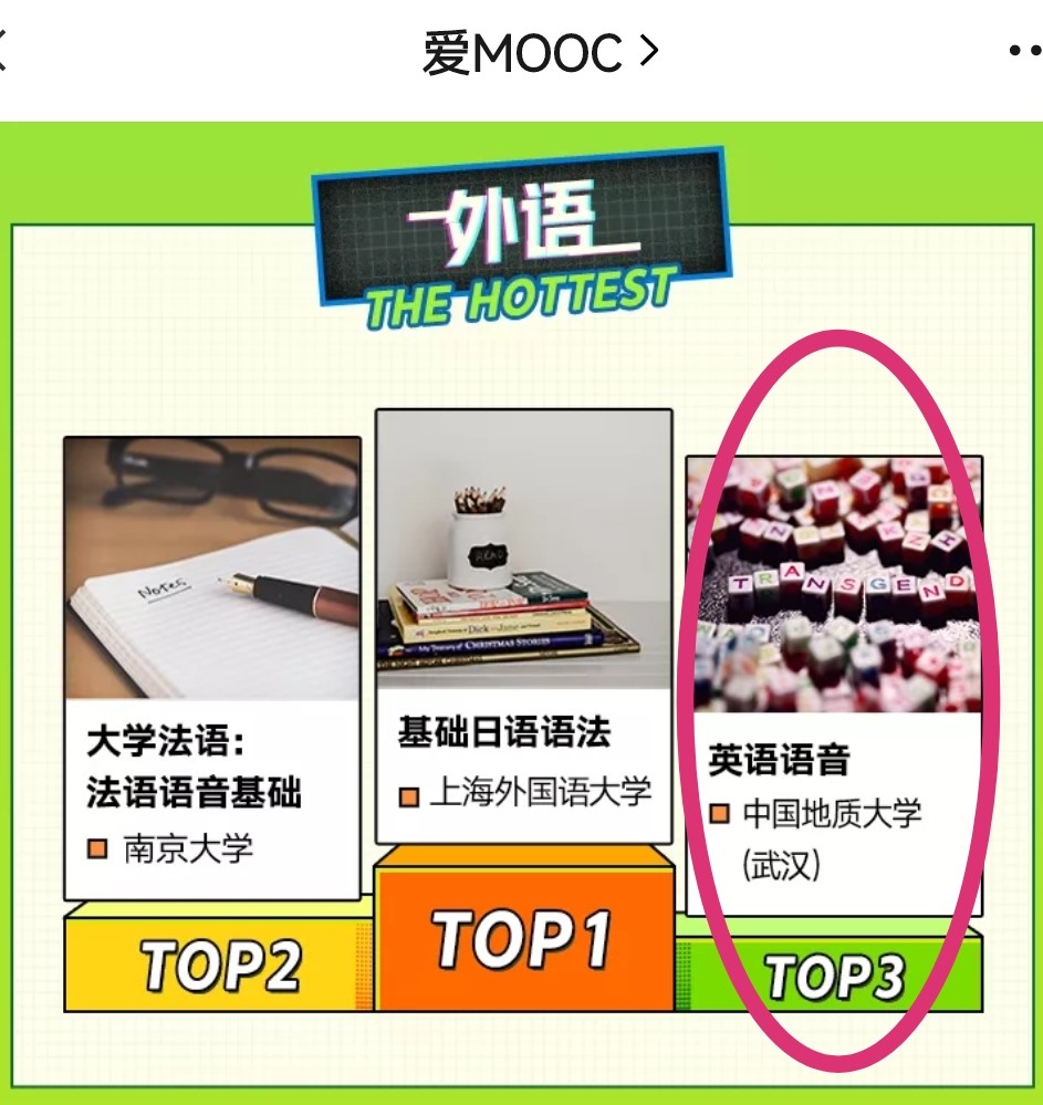 地大新聞網(wǎng)訊(通訊員 龔伍軍)1月17日,中國大學(xué)MOOC網(wǎng)(愛課程網(wǎng))發(fā)布2021年度課程榜單,我校王國念老師主持的《英語語音》慕課在外語學(xué)科中喜提“探花”。