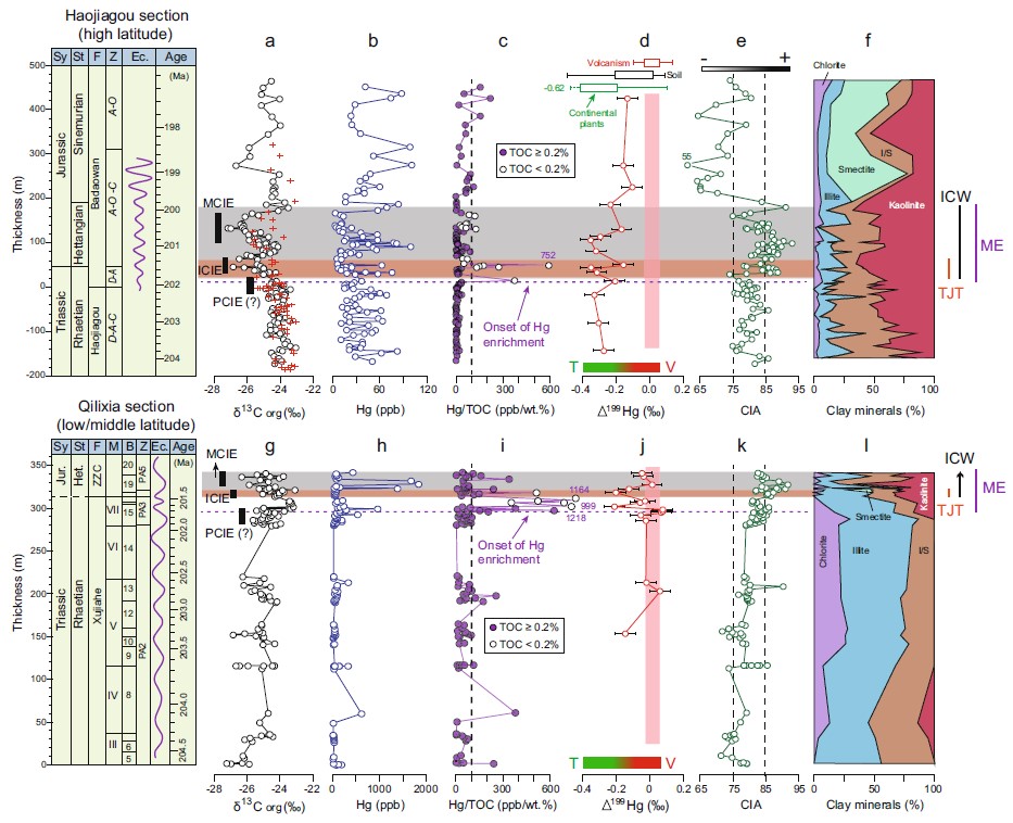 研究團隊選擇了東亞地區代表高緯度(新疆準噶爾盆地的郝家溝)和中低緯度(四川盆地宣漢地區)的兩個發育連續的三疊紀-侏羅紀之交地層剖面,開展多種方法的分析和研究,包括有機碳同位素、汞濃度和同位素、化學蝕變指數和粘土礦物等,目的在于探究三疊紀-侏羅紀之交界線陸地沉積物中火山活動的記錄及大陸化學風化響應。這些剖面遠離中大西洋大火成巖省, 可以探究該時期大西洋大火成巖省對遠離其噴發口區域的影響。