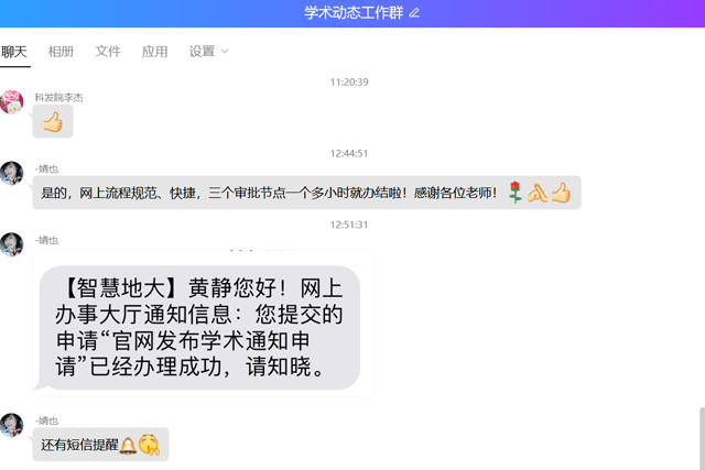 地大新聞網訊(通訊員張磊)“網上流程規范、快捷,三個審批節點一個多小時就辦結啦,感謝各位老師”“還有短信提醒呢”近日,在學校辦公室組建的“學術動態工作群”里,工程學院黃靜老師得知她在網上服務大廳提交的學術海報申請被快速受理后,按捺不住內心的喜悅,一連在QQ群里發了好幾條信息。