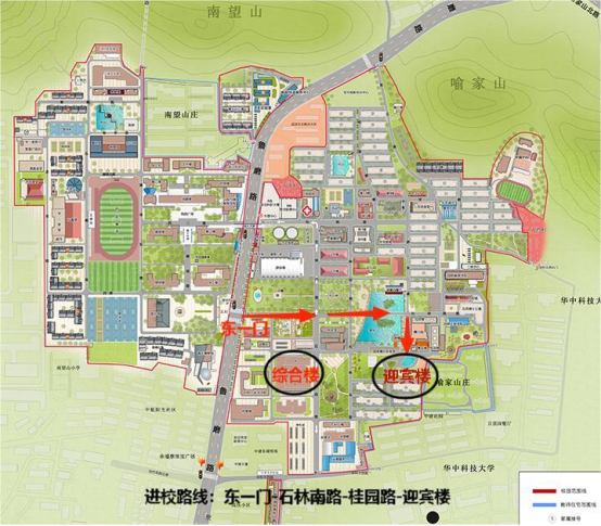由中國地質大學東區東一門(即懸掛有“中國地質大學研究生院”名牌的校門)進入校園,直行約400米通過紅軍橋后右轉,直行100米即可到達迎賓樓報到注冊地點。
