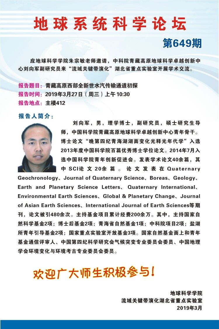 [3月27日]地球系統科學論壇:中科院青藏高原地球科學卓越創新中心劉向軍副研究員學術報告