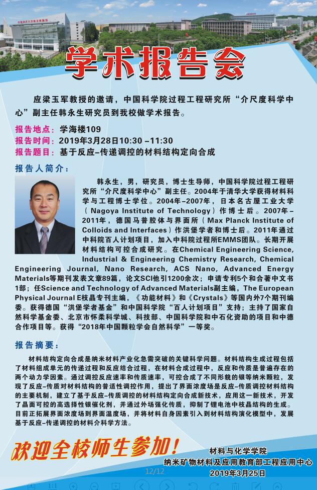 [3月28日]材化學術論壇:中國科學院過程工程研究所“介尺度科學中心”副主任韓永生研究員學術報告