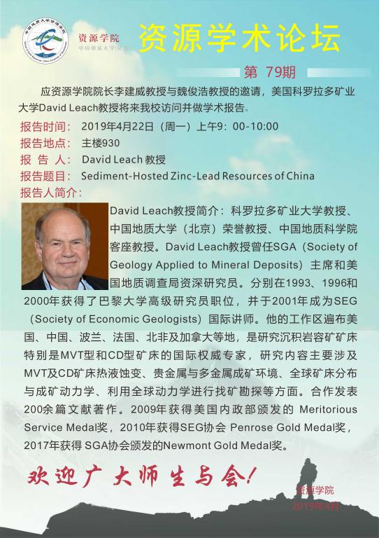 [4月22日]資源學術論壇:美國科羅拉多礦業大學David Leach教授學術報告