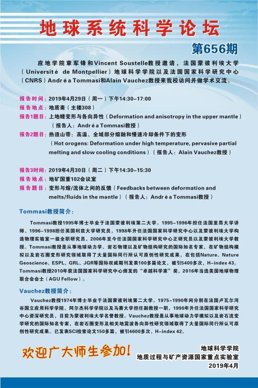 [4月29-30日]地球系統科學論壇:法國蒙彼利埃大學地球科學學院及法國國家科學研究中心Andréa Tommasi和Alain Vauchez教授學術報告