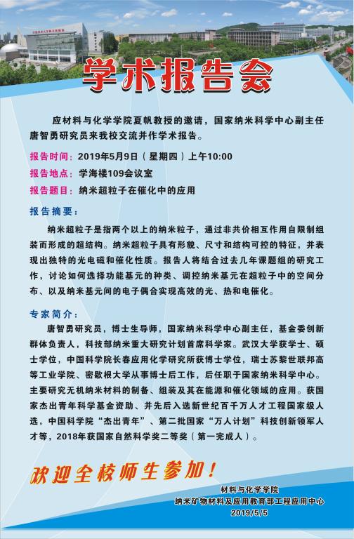 [5月9日]材化學術論壇:國家納米科學中心副主任唐智勇研究員學術報告