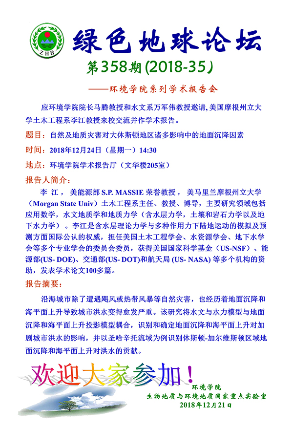 [12月24日]綠色地球論壇:美國摩根州立大學土木工程系李江教授學術報告