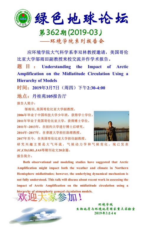 [3月7日]綠色地球論壇:美國哥倫比亞大學鄔雨田副教授學術報告
