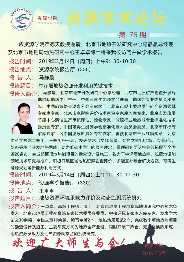 [3月14日]資源學術論壇:北京市地熱開發研究中心馬靜晨總經理及北京市地勘局地熱研究中心王卓卓博士學術報告