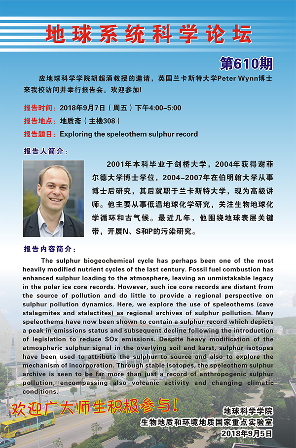[9月7日]地球系統科學論壇:英國蘭卡斯特大學Peter Wynn博士學術報告