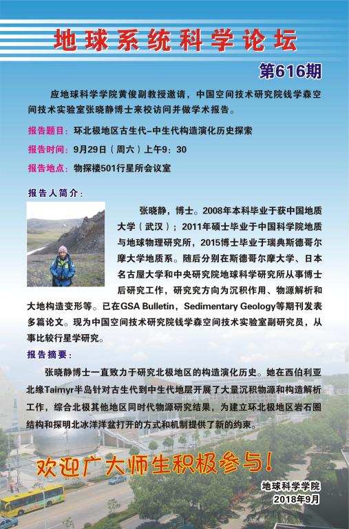 [9月29日]地球系統科學論壇:中國空間技術研究院錢學森空間技術實驗室張曉靜博士學術報告