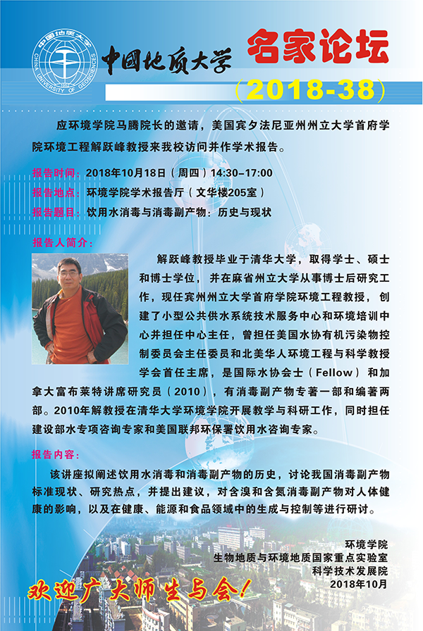 [10月18日]名家論壇:美國賓夕法利亞州州立大學首府學院環境工程解躍峰教授學術報告