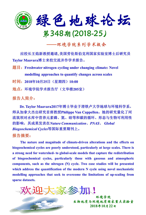 [10月25日]綠色地球論壇:美國(guó)勞倫斯伯克利國(guó)家實(shí)驗(yàn)室博士后研究員Taylor Maavara博士學(xué)術(shù)報(bào)告